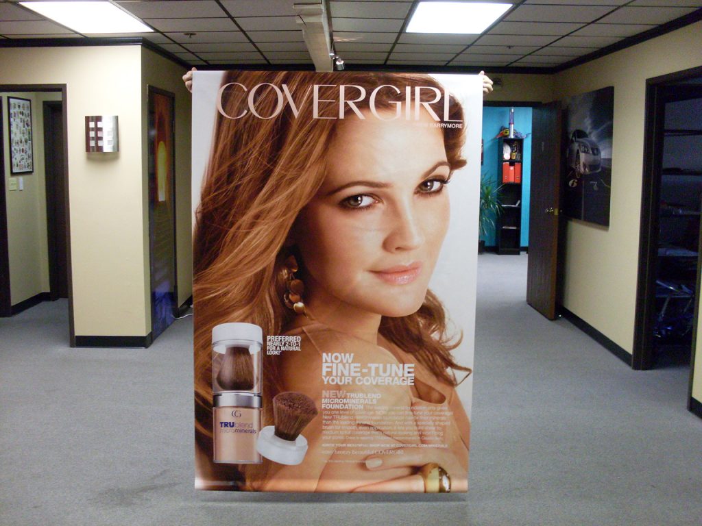 We print on 13 and 18 oz banner, mesh for wind resistance, blockout vinyl for double-sided displays, canvas, adhesive vinyl, and specialty materials for specific applications.